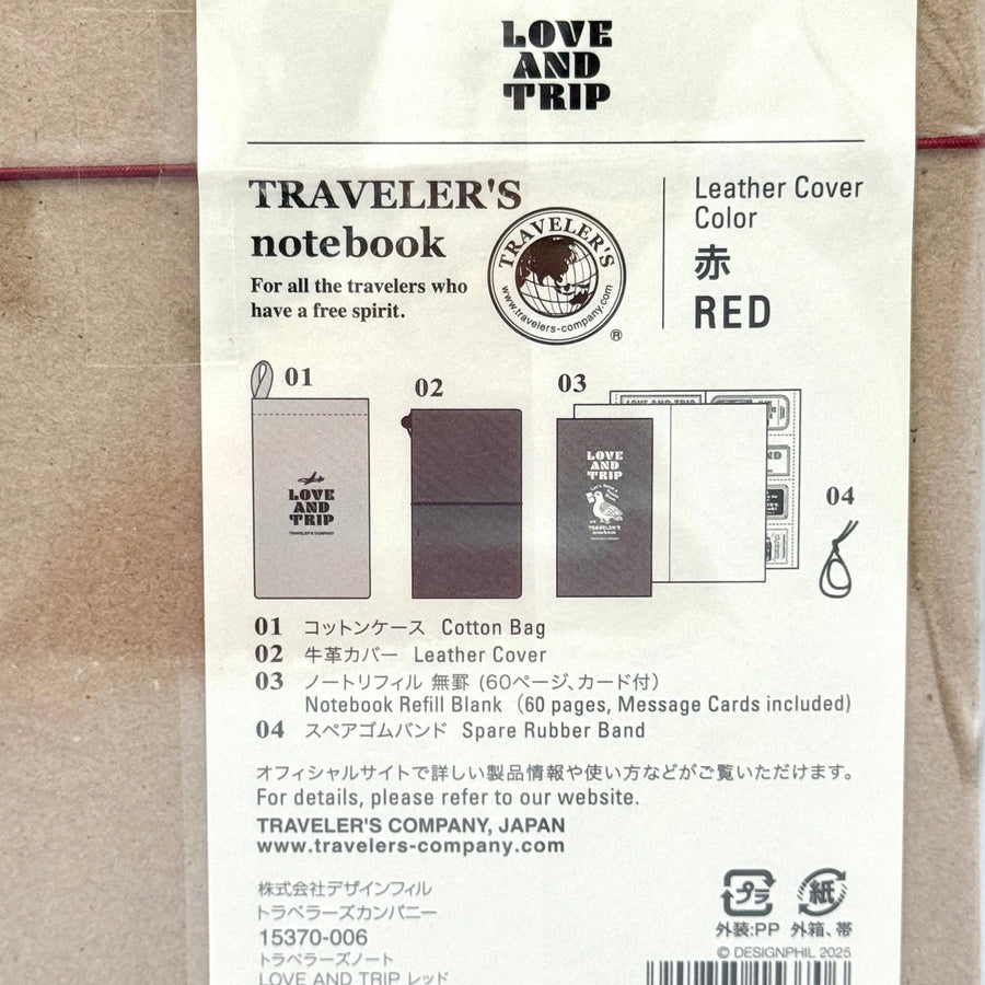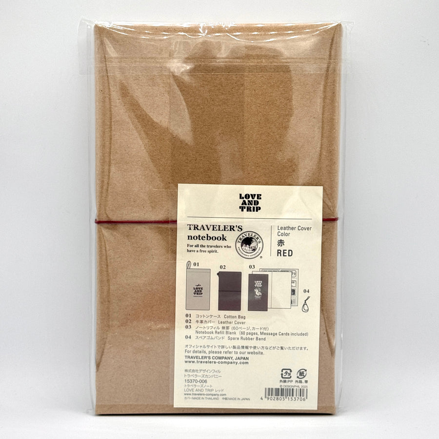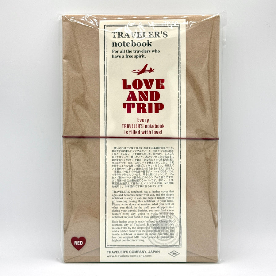 The Traveler's Company 15370-006 LOVE AND TRIP Edition is a limited-release regular-size leather notebook that celebrates the spirit of exploration and affection. Crafted from rich, burgundy-red leather, this notebook symbolizes passion and vitality, making it an ideal companion for documenting life's journeys. The back cover features an embossed "LOVE AND TRIP" logo, adding a touch of elegance and uniqueness. This starter kit includes a blank refill, spare elastic band, and a cotton storage bag, providing everything needed to embark on your writing adventure. Handmade in Thailand with meticulous attention to detail, it embodies the quality and craftsmanship synonymous with Traveler's Company.