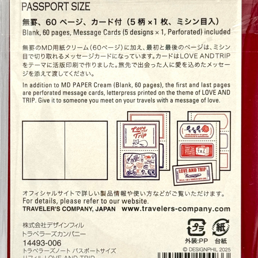 The Traveler's Company 14493-006 Love and Trip Passport Size Refill is a special Red Edition insert celebrating love and adventure. Designed to complement the limited-edition red leather passport notebook, this refill features a vibrant red cardstock cover with a foil-stamped "Love and Trip" motif. Inside, you'll find 60 pages of unlined MD Cream paper, known for its smooth writing surface and fountain pen compatibility. Two sheets of perforated message cards with themed artwork are also included, perfect for notes, sharing, or creative expressions. Designed for the Passport Size Traveler's Notebook, this refill is a charming addition to any collection.